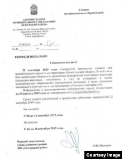 В Архангельске чиновники обратились к местным властям с просьбой провести "позитивные мероприятия" 22 сентября в единый день эко-протеста против строительства мусорного полигона в поселке Шиес. Утром 4 сентября активисты получили письмо, адресованное главам всех муниципальных образований Плесецкого района Архангельской области. Сотрудников администраций попросили, чтобы они провели любые "позитивные мероприятия" 22 сентября на центральных площадках.