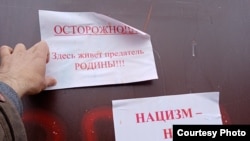 Надпись "предатель" также сегодня ночью появилась на дверях квартир у двух петербургских активистов Асана Мумджи и Ольги Смирновой. Неизвестные оставили после записки с угрозами и навоз.