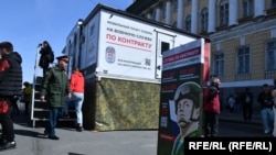 В Петербурге парад длился на пять минут дольше, чем в Москве, – 50 минут. После его завершения на Дворцовую площадь привезли мобильный пункт отбора на военную службу.